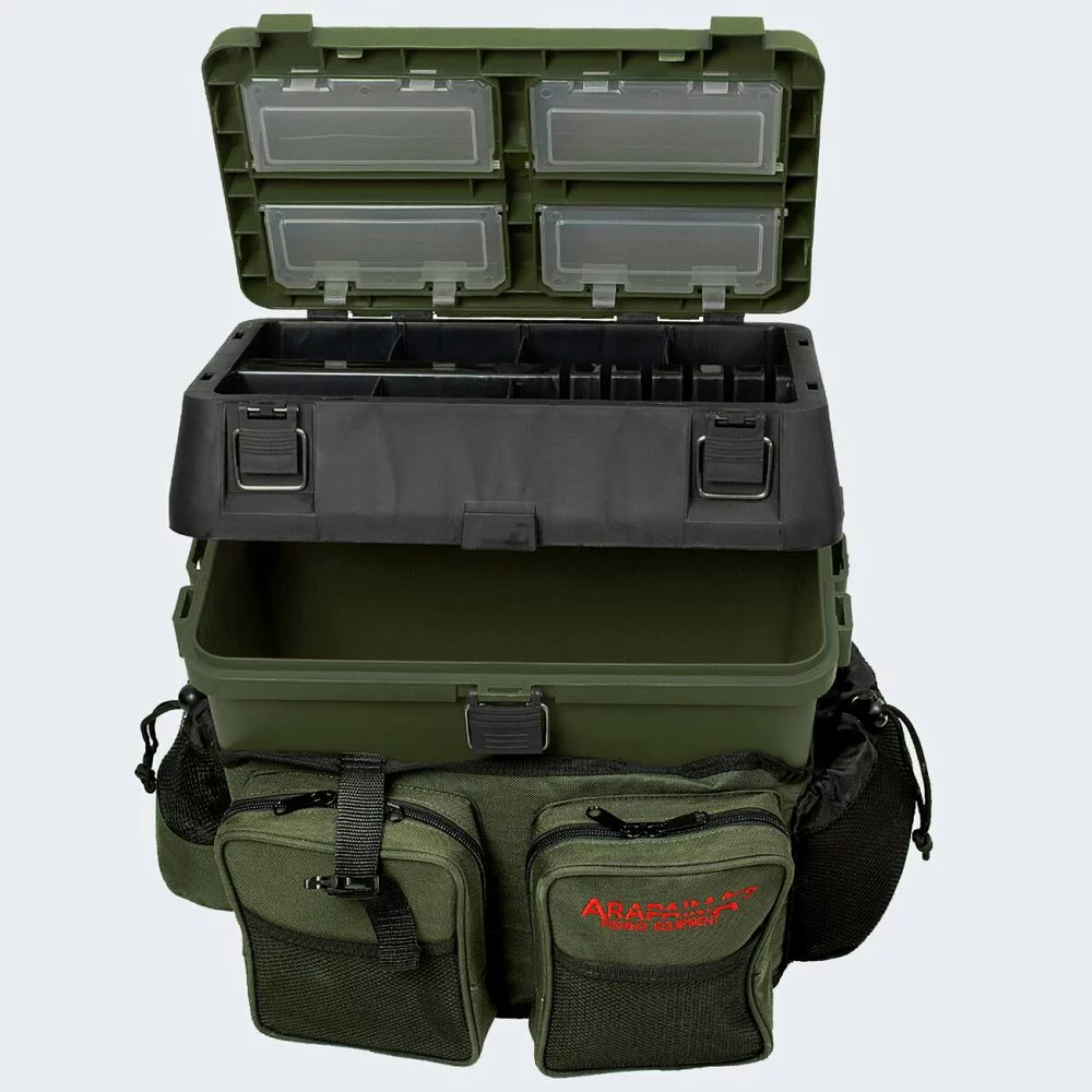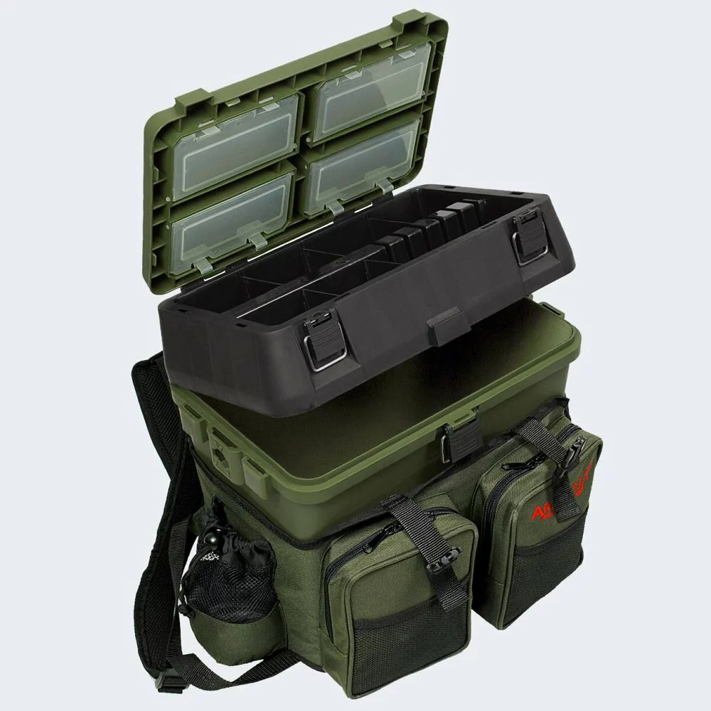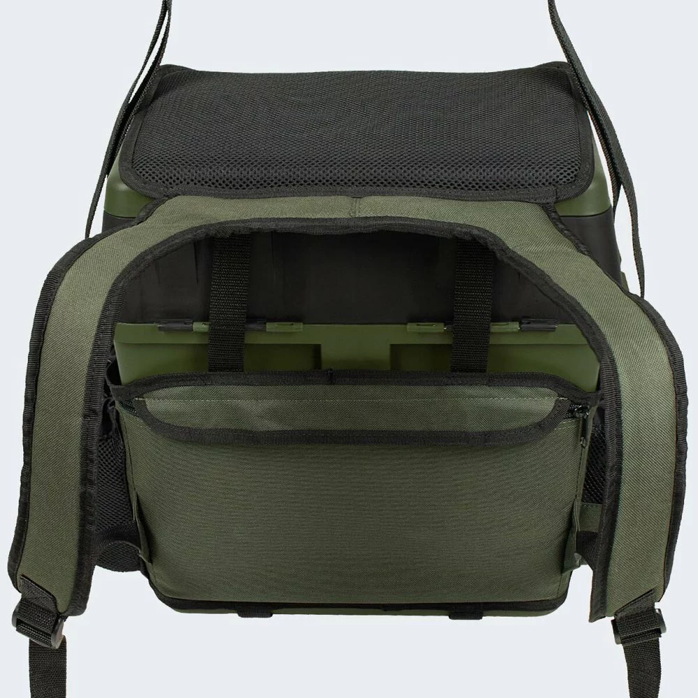 -usable as a seat and equipment box – four plastic boxes inside the lid included – incl.two side trays easy to attach and remove – can be worn as a backpack thanks to the shoulder straps – spacious main compartment – two front zipped pockets – two side pockets for p.
