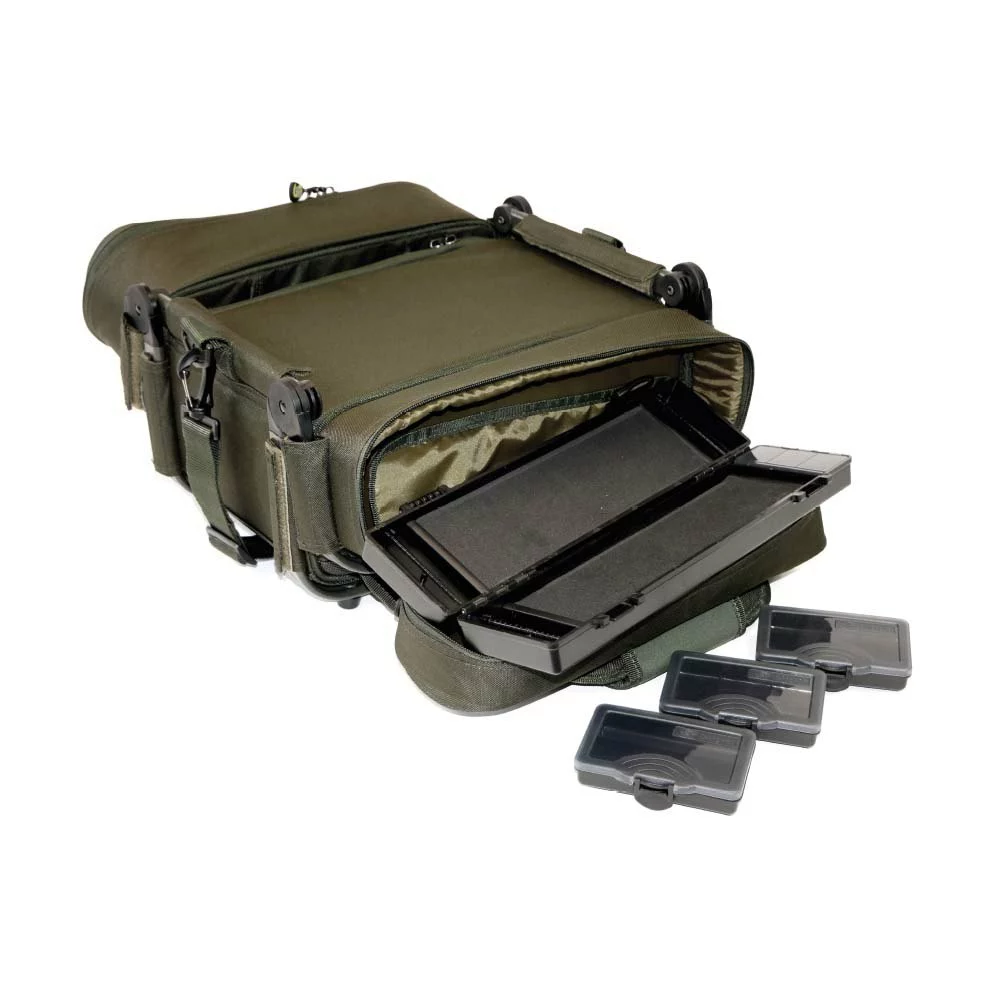 – The carryall is supplied with 2 large storage boxes (in large base pocket), 1 medium store box (in side folding pocket) and 3 small storage boxes (in side folding pocket).