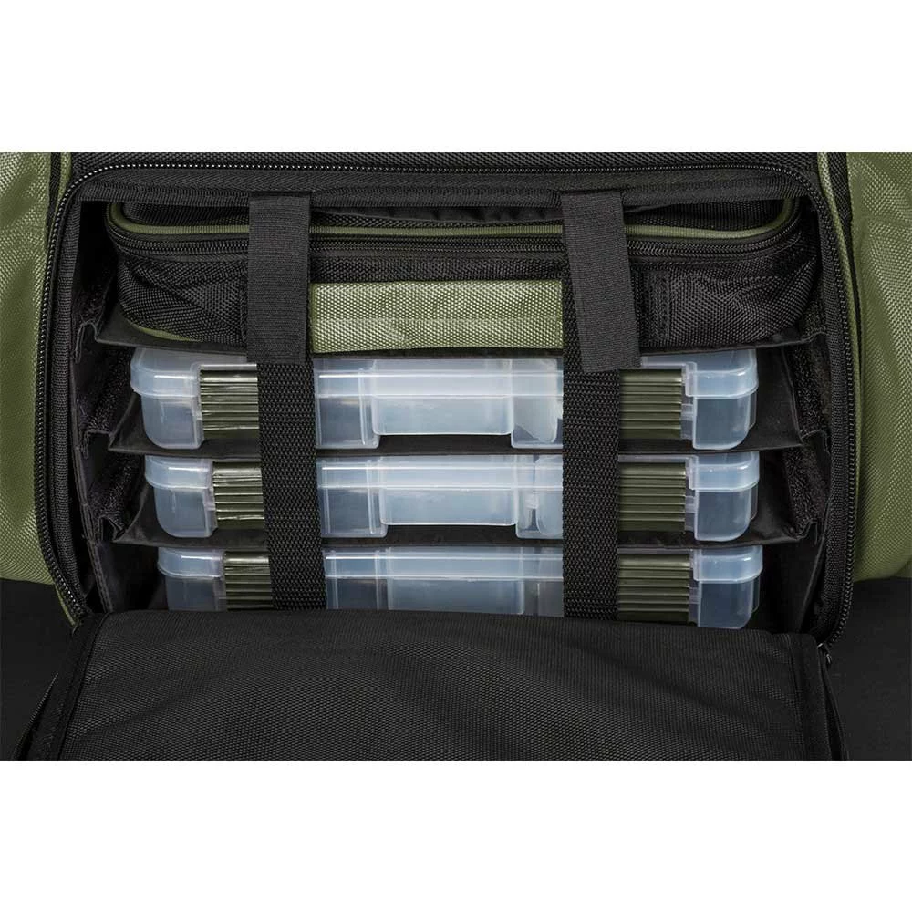 Backpack designed for competitive surf casting fishing, but equally valid for any type of fishing that requires storing and organizing a large number of items. It can be carried on the back as a backpack, although it also has a comfortable shoulder strap for shorter journeys and a suitcase-type handle. It has an infinite number of pockets and internal and external compartments to store all kinds of utensils. It has large side pockets with cream on both sides, in which the Spool box fits perfectly, a semi-rigid case with zipper and dividers to house 6 replacement Cayman / Cyclone type spools. The case is already included in the backpack, although it can also be purchased separately. Both pockets have additional outer pockets.