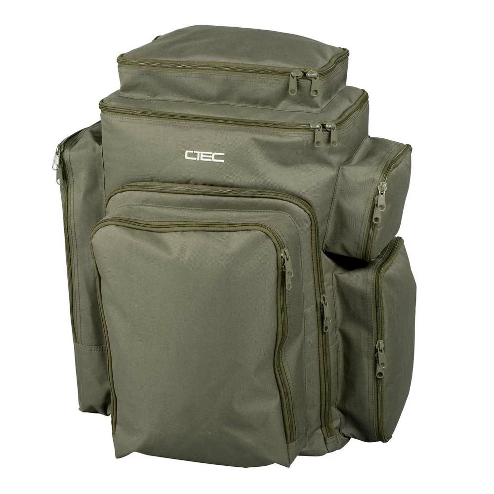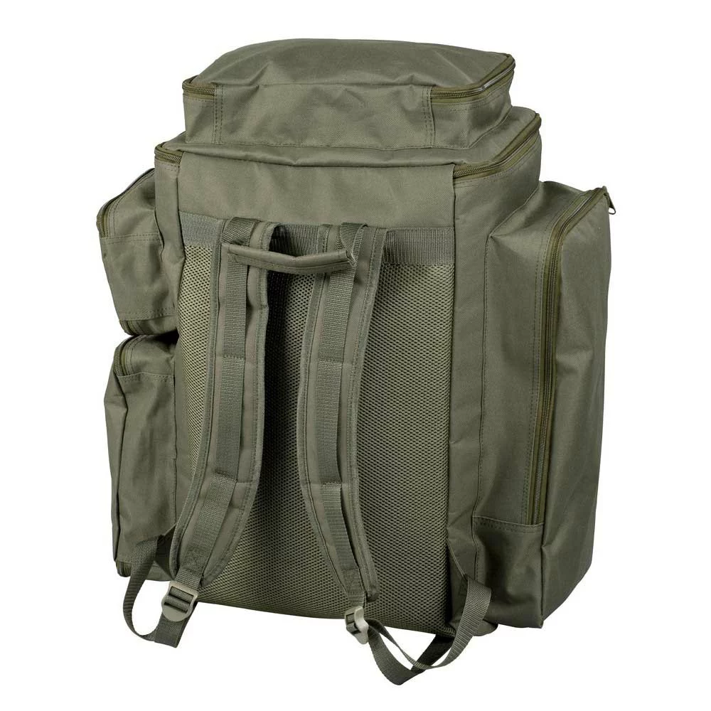 A large backpack with lot of storage options. There is a pocket on the left where you can store your buzzerbars, a pocket for your tackle box on the front, the right side has 2 pockets for various accessories and there is another practical pocket on top for storage of phone, wallet or similar things. The main compartment can be reached from the top or front, which can be very useful when you need to reach the bottom of the bag.