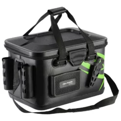 Semi-rigid bag with rigid top to transport fishing material. It has a large inner pocket and a small Mesh pocket on the front plus a special pocket for scissors or pliers. The lid closes with zipper in addition to a Velcro closure in case we do not want to be opening and closing the zipper every time we take something from the inside pocket. In one of the sides it has two rod holders that allow to carry the rods while we move or leave the rod for example to change the lure, make a knot, etc It has a shoulder strap and handles to transport it comfortably.