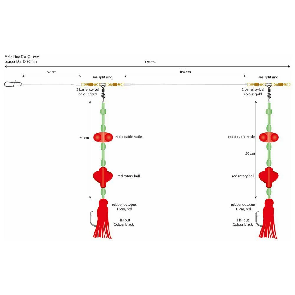 Rig made for cod and hake angling. Rounded hook creates self-striking action. Made for angling with heavy weights in deep waters, with best results slightly above the bottom.