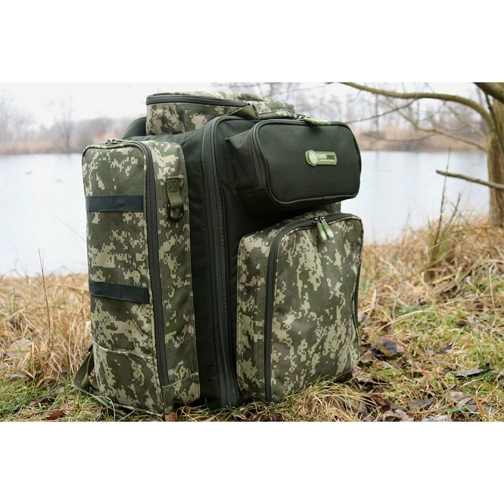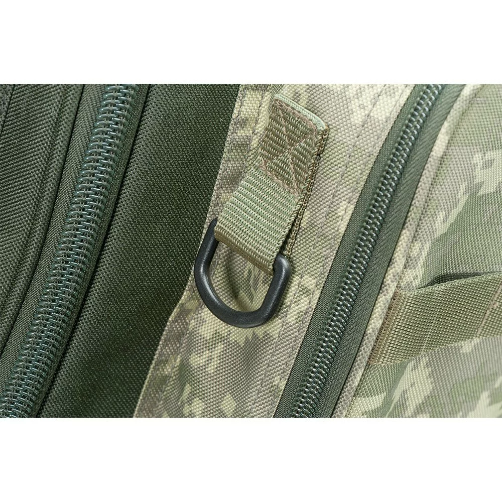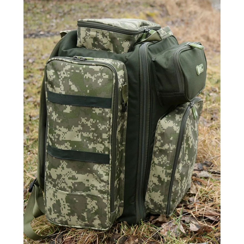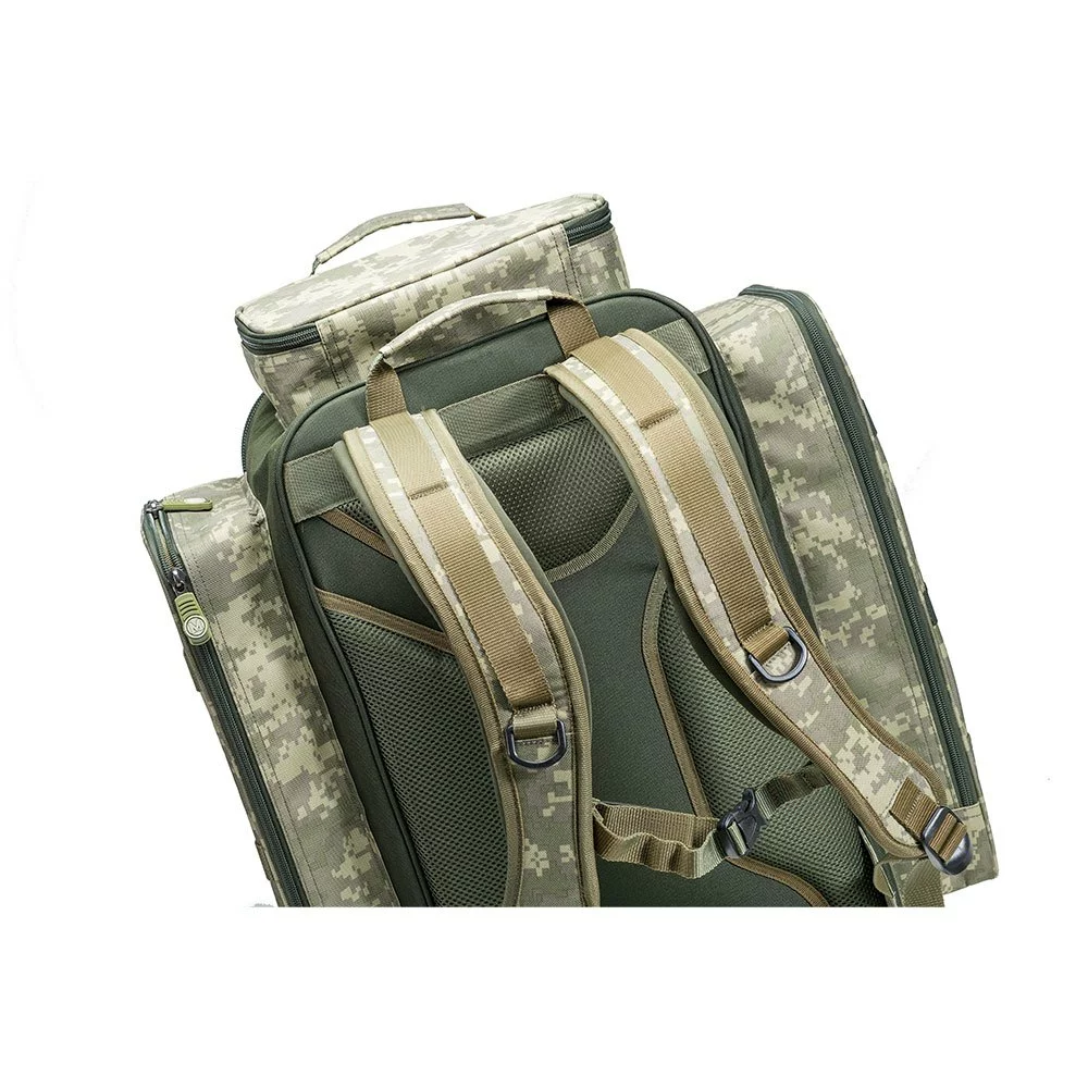 A fully featured luxurious rucksack in a digital camouflage design.