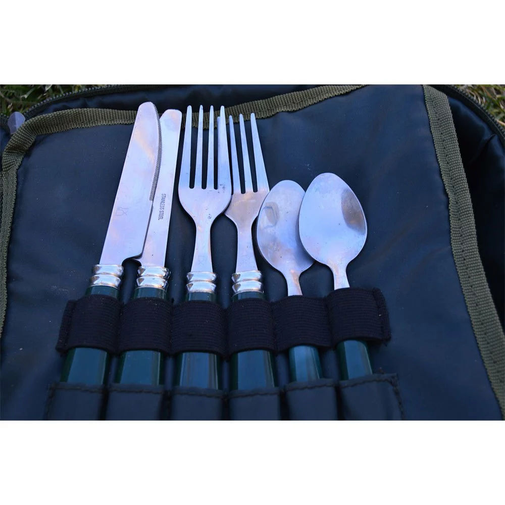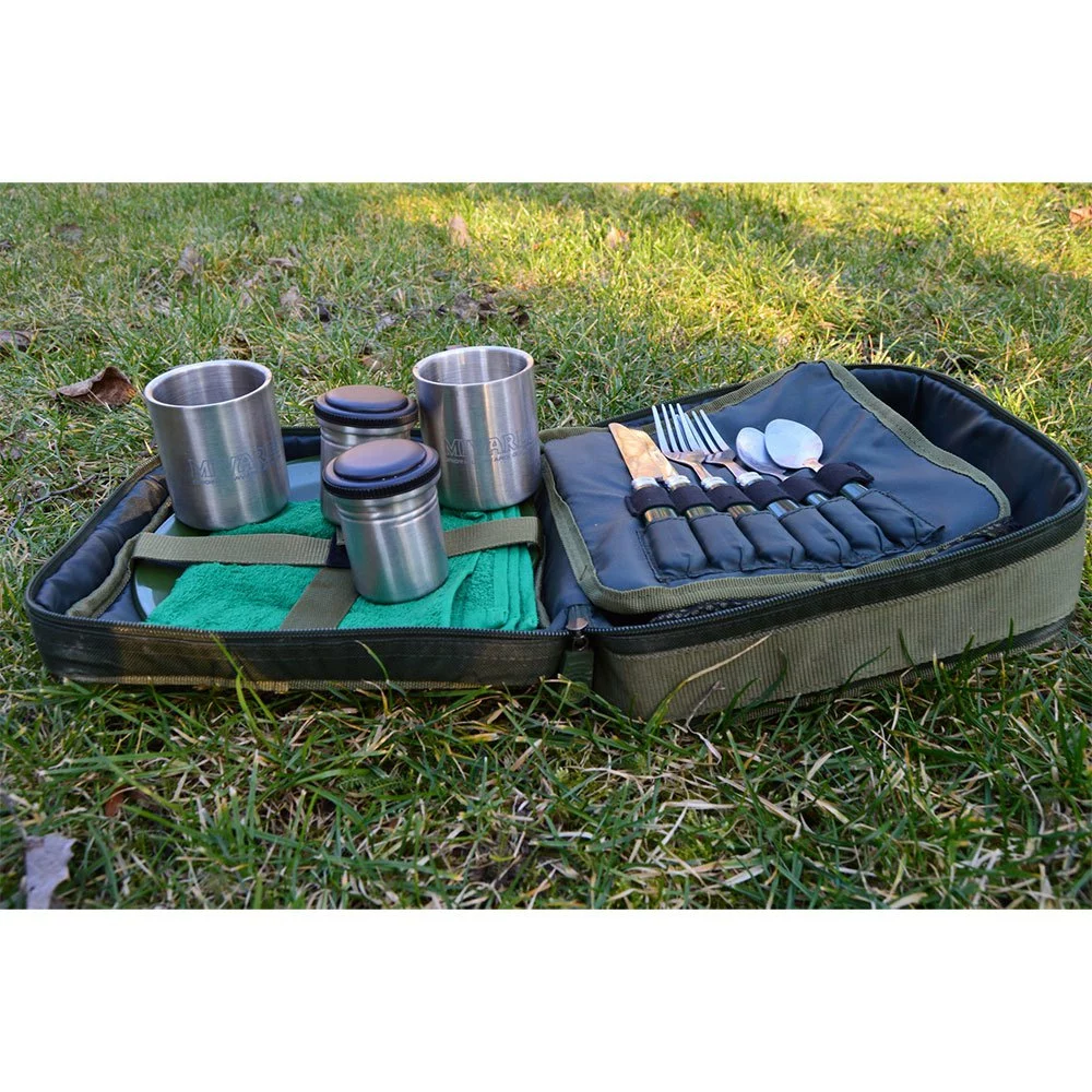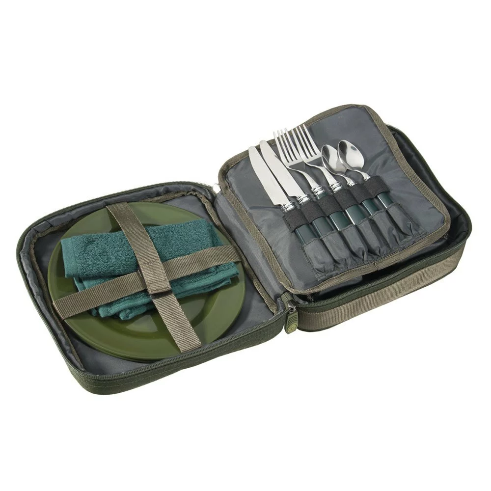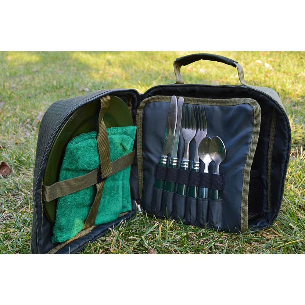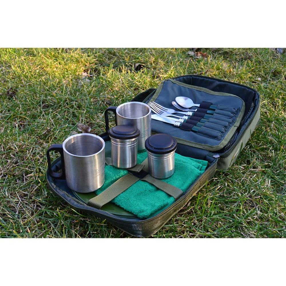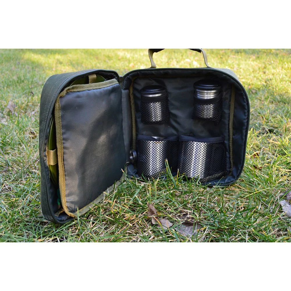 A set of the high quality accessories for dinning in the bivvy. Includes a tea towel, durable plastic plates, stainless steel vacuum cups, two sets of cutlery and stainless steel sealed tins for sugar and salt. All items are supplied in a high quality water proof pouch with a zip and transport handle.